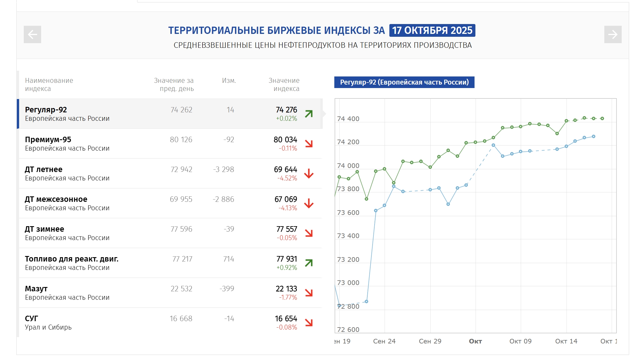Сейчас стоимость АИ-92 находится на историческом уровне и составляет 74 276 за тонну. Чуть лучше дела обстоят с АИ-95, где цена отступила от максимума — 80 034 рублей за тонну.