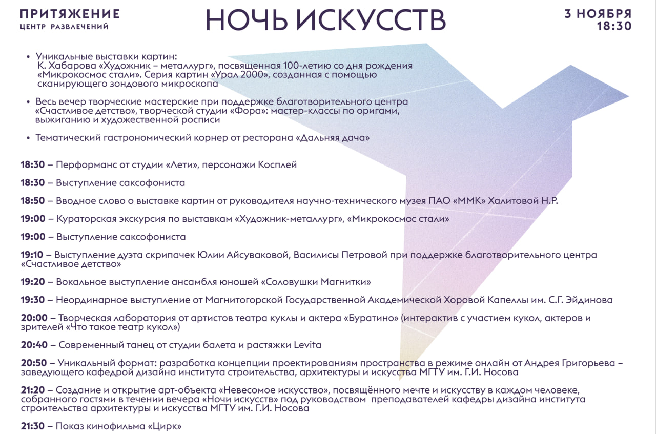 Парк "Притяжение" впервые примет станет площадкой всероссийской акции "Ночь искусств". Все пройдет 3 ноября с 18:30 до 23:00 в Атриуме Центра развлечений.