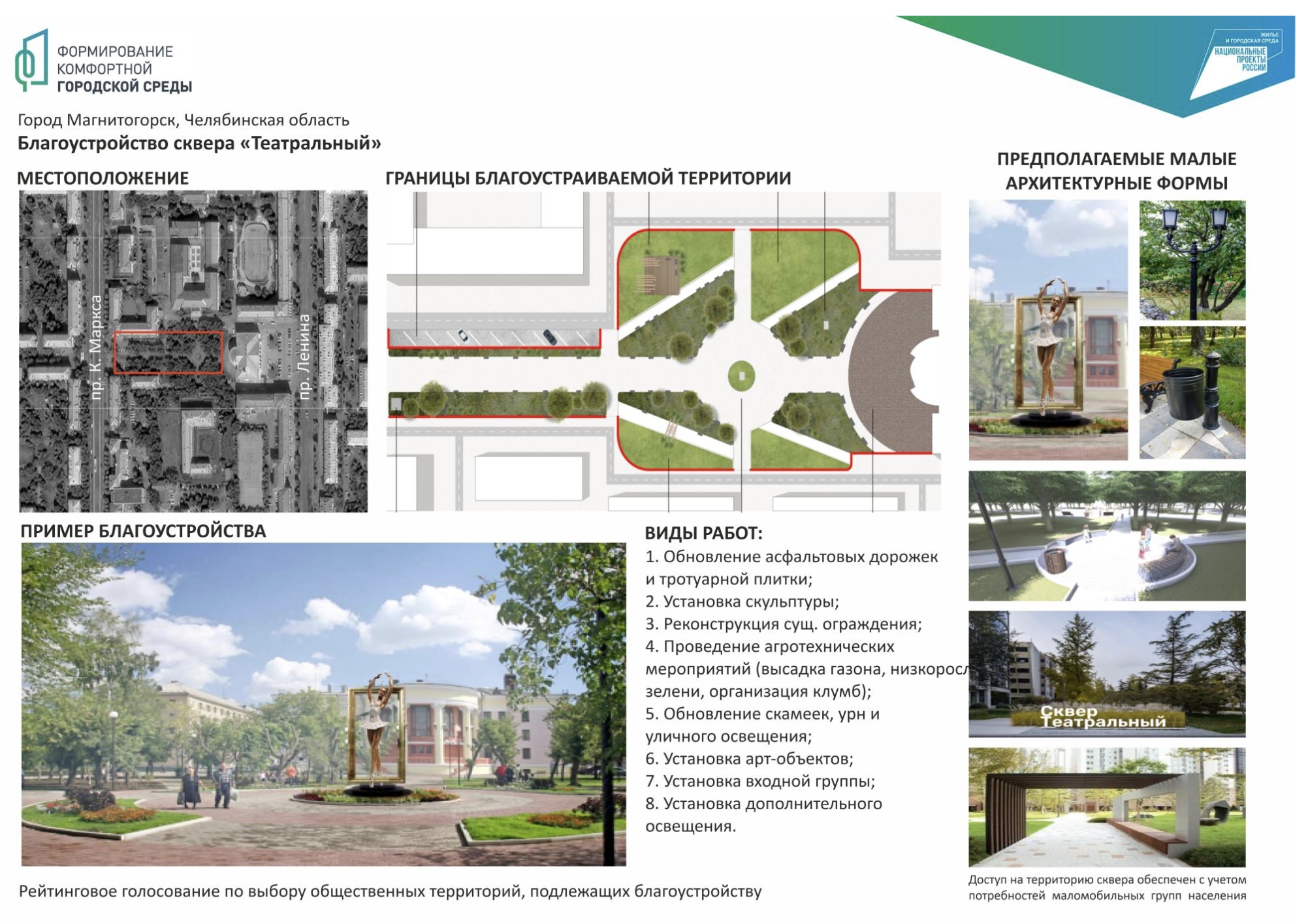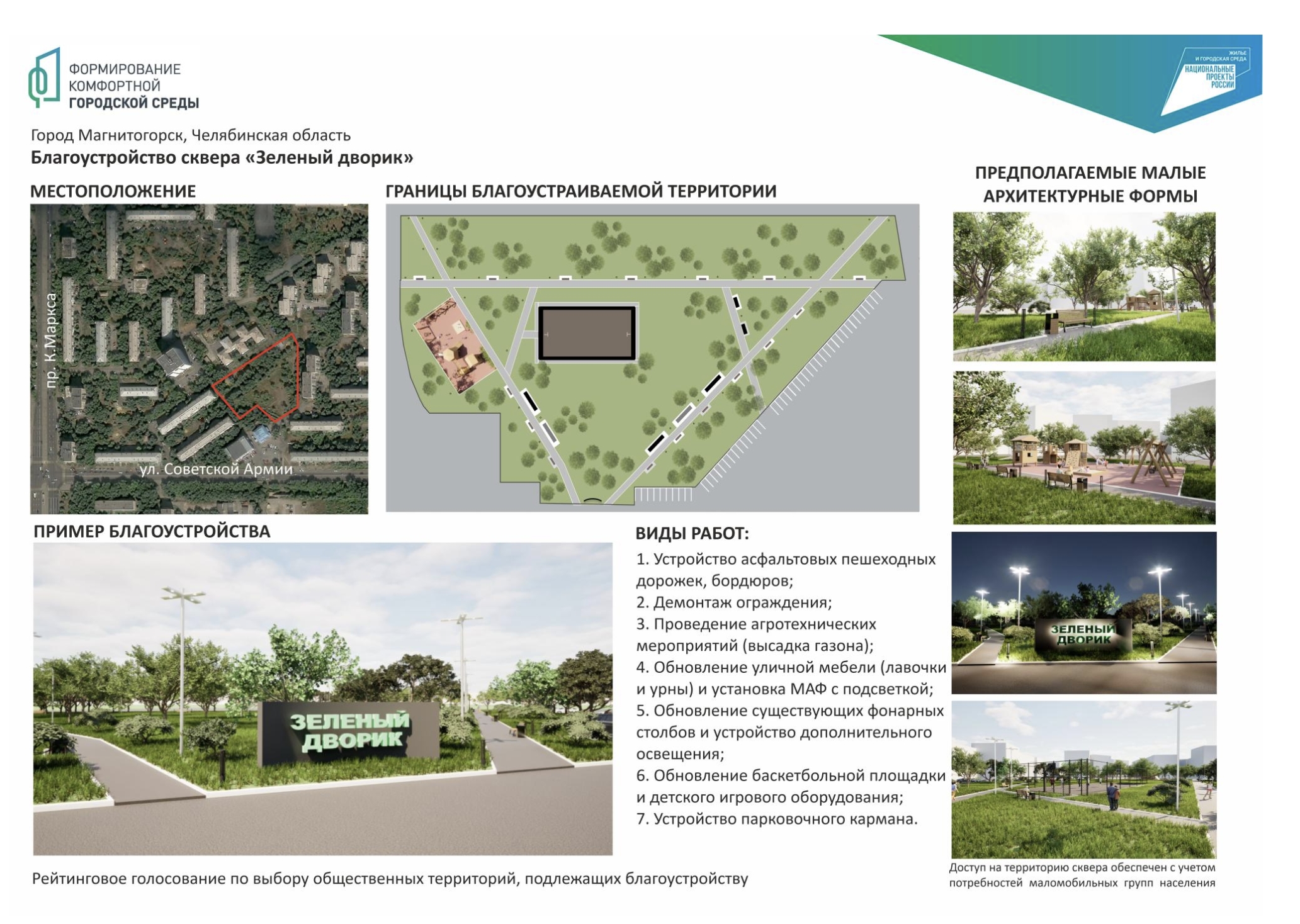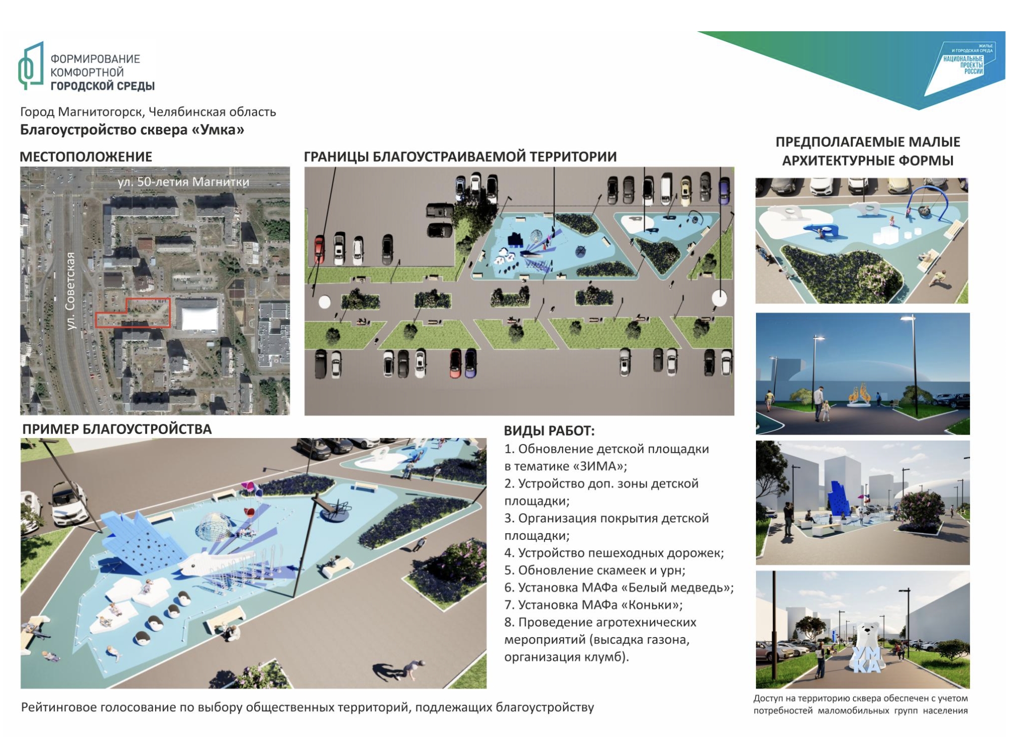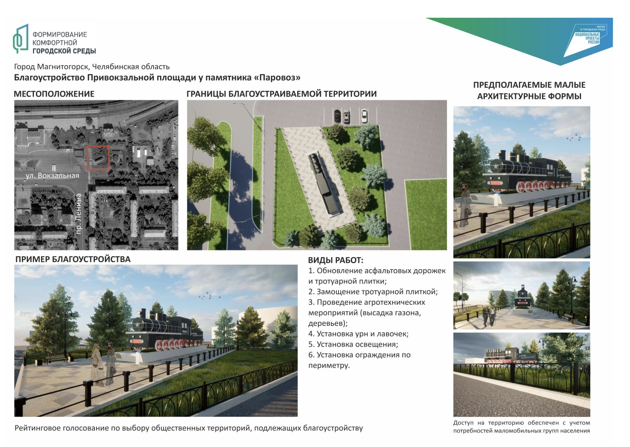 Среди кандидатов на победу - шесть общественных территорий. Скверы: Умка, Зеленый дворик, Городской, Театральный, а также привокзальная площадь у памятника «Паровоз» и общественная территория вдоль дома №126 по пр. Карла Маркса. С дизайн-проектами можно ознакомиться ниже.