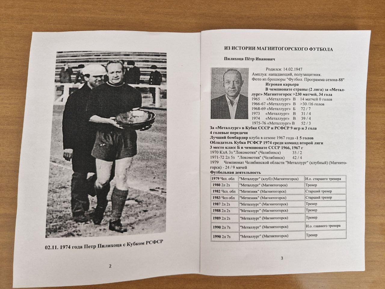 Об обладателе Кубка России выпустили брошюру.Настоящий хранитель истории магнитогорского футбола Вячеслав Гмызин составил и выпустил в свет небольшую книжку-брошюру «Легенды ФК «Металлург-Магнитогорск» о легенде магнитогорского футбола, нападающем, лучшем бомбардире клуба в сезоне 1967 года, обладателе Кубка РСФСР 1974 года